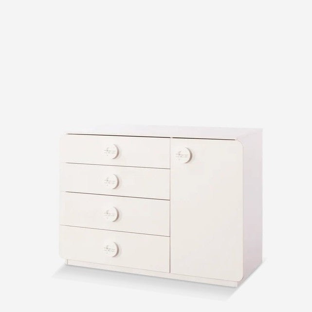 The Baby Cotton Large Dresser with Storage Cabinet comes in white and features decorative handles for a serene nursery look.