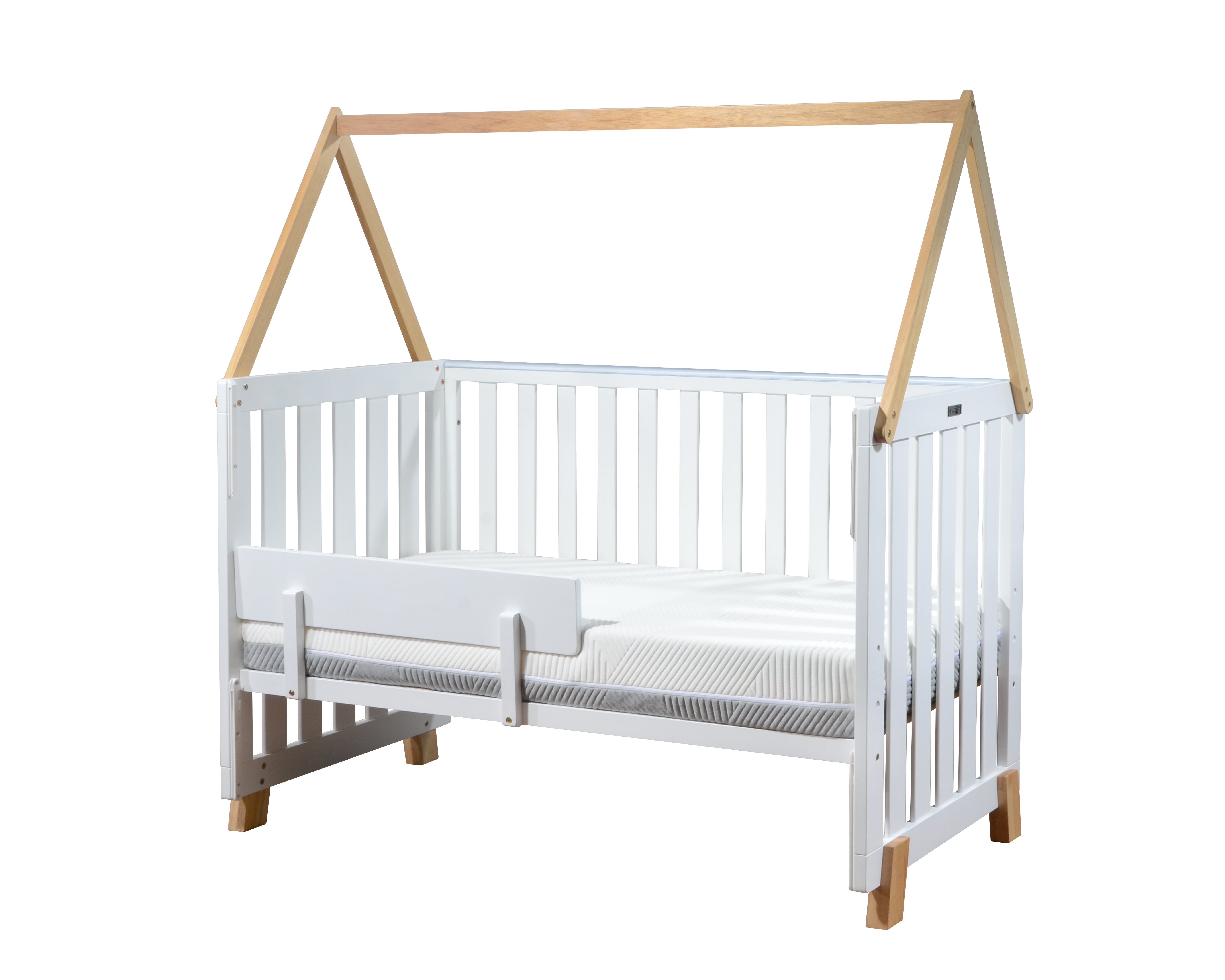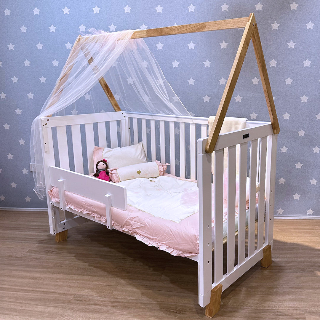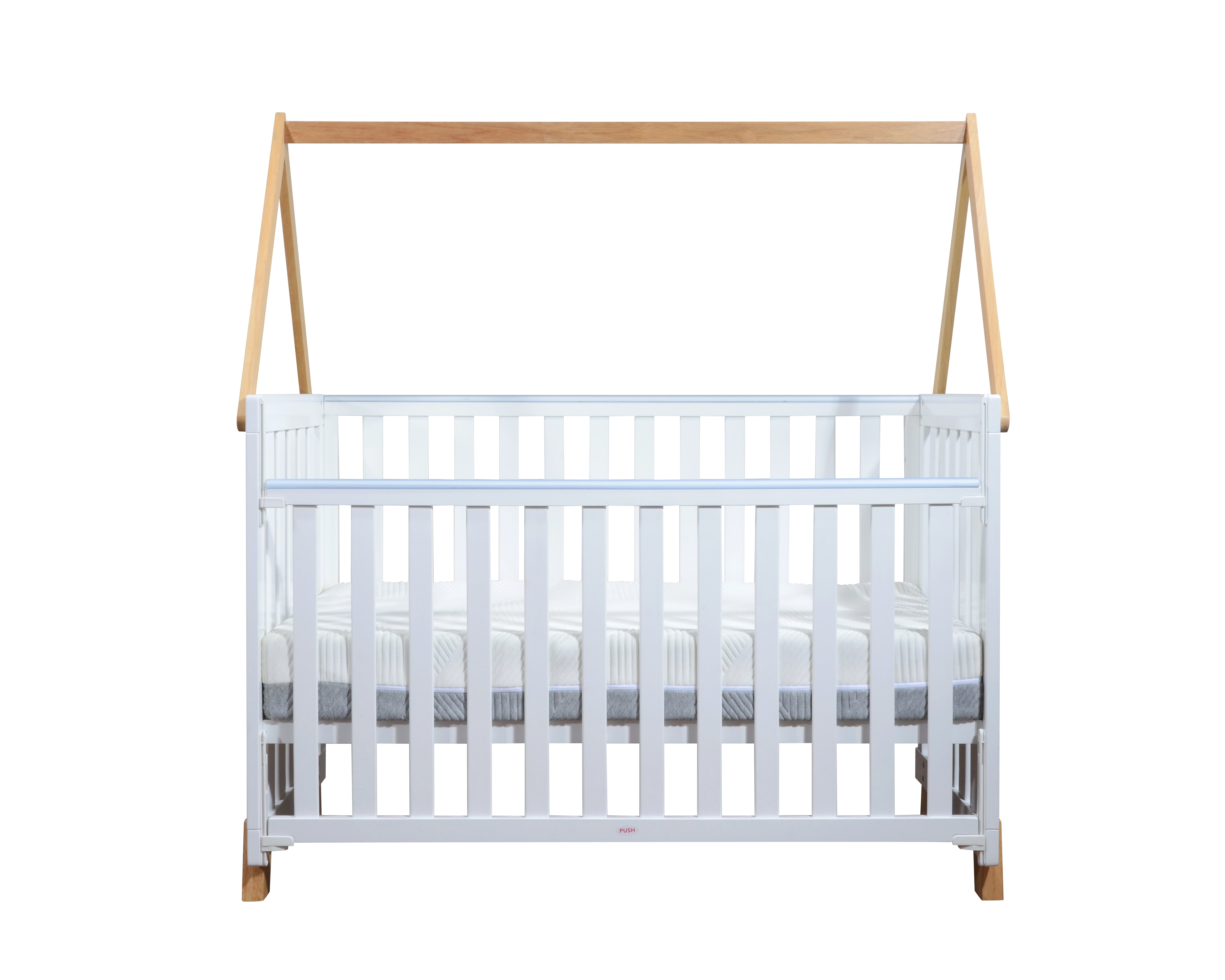 The Alexis Baby Cot combines a sleek white and wooden roof design for a serene sleeping space for your little one. Its sturdy frame and modern aesthetic makes it the perfect blend of comfort and functionality for any nursery.