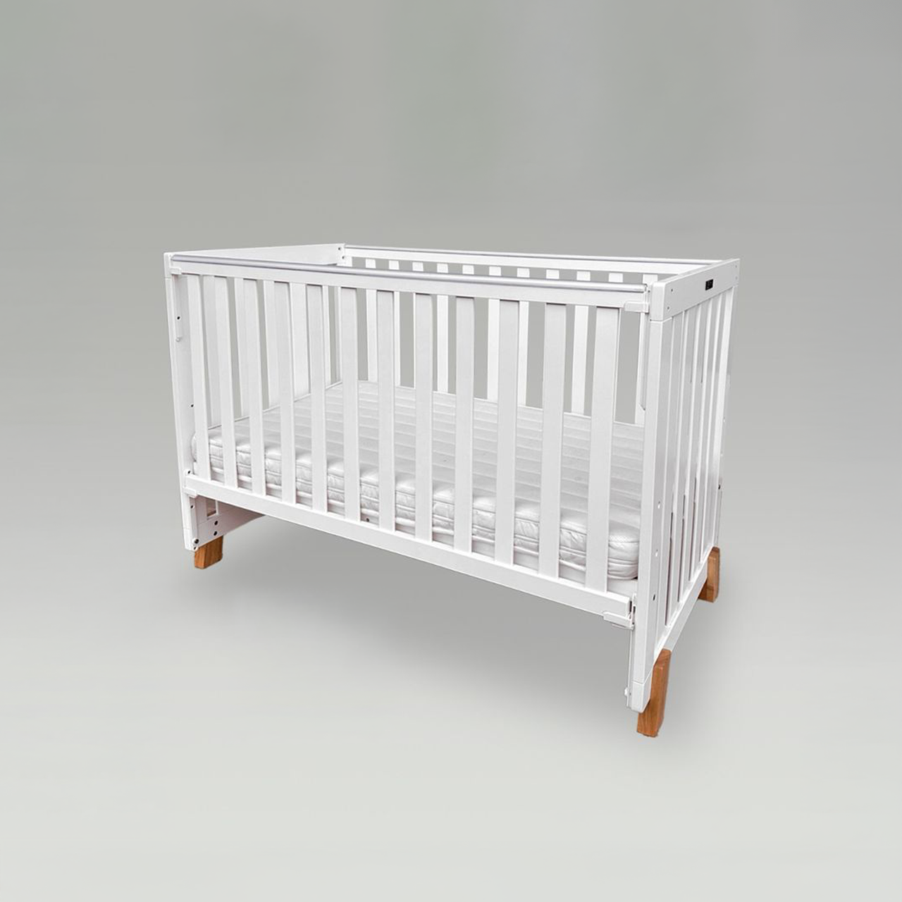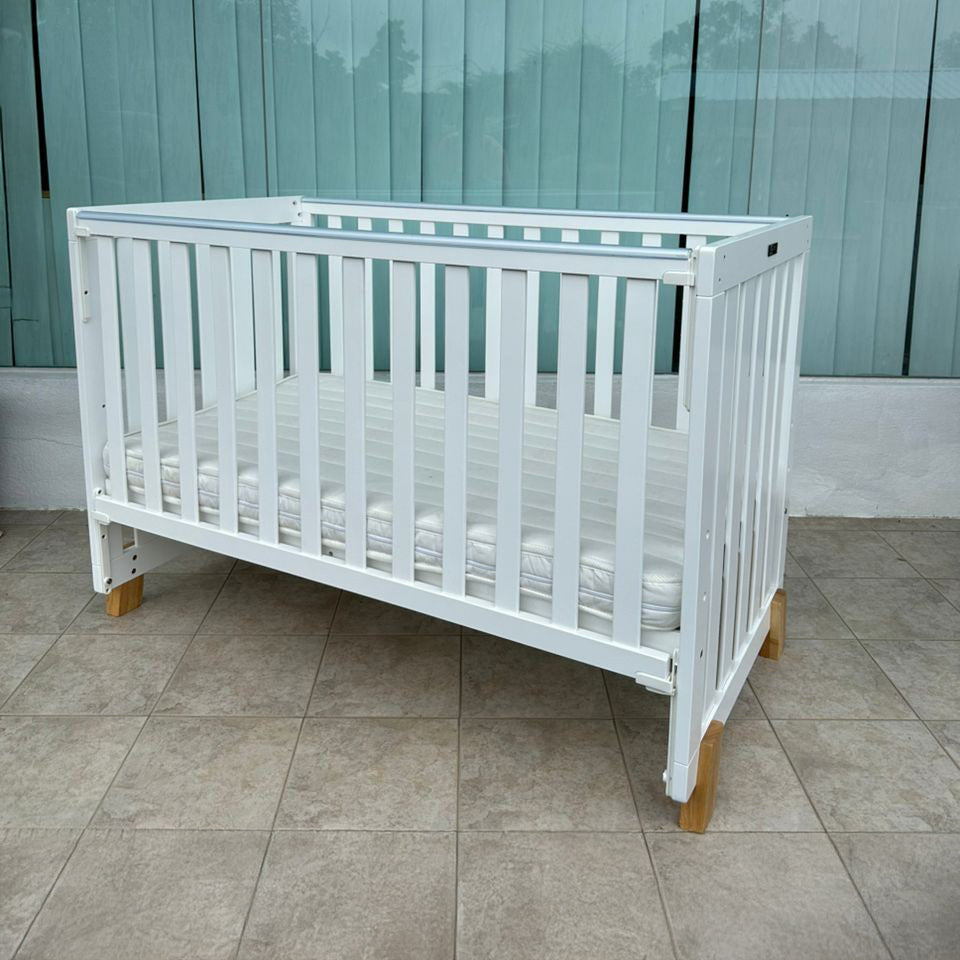The Reece Baby Cot combines sleek white with wooden support post design for a serene sleeping space for your little one. Its sturdy frame and timeless aesthetic makes it the perfect blend of comfort and functionality for any nursery.