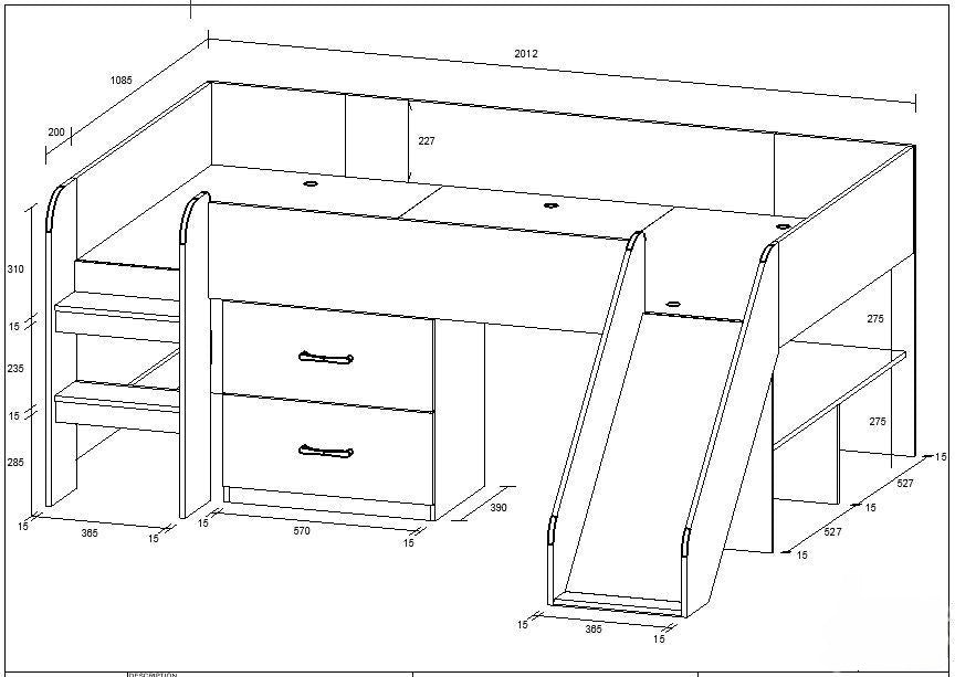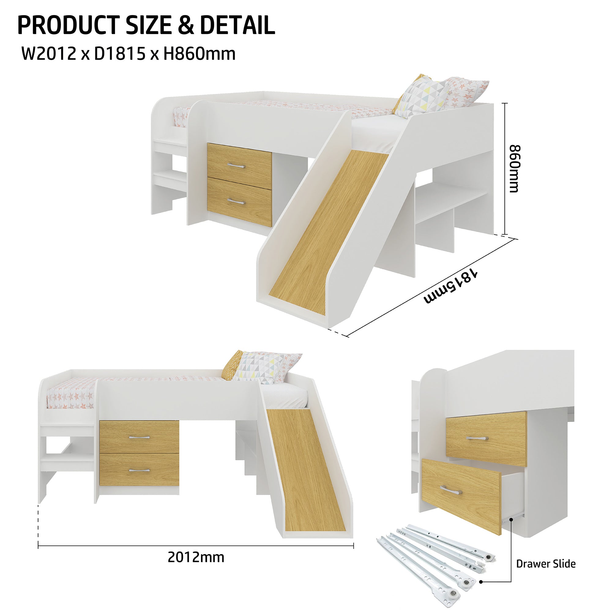 1 x Low loft bed with slide, ladder, 2 drawers, underbed side shelving.