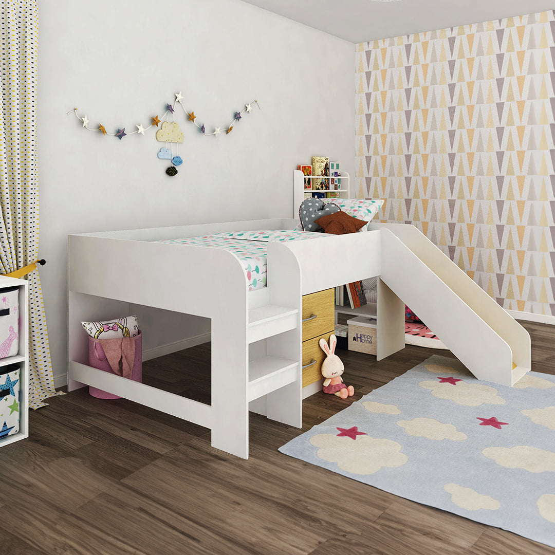 The Toro Low Loft Bed is a fun and functional loft bed that features a built-in slide for easy access and added playtime fun, perfect for any child's room. With ample storage space underneath, it keeps toys and essentials neatly organized while maximizing floor space.
